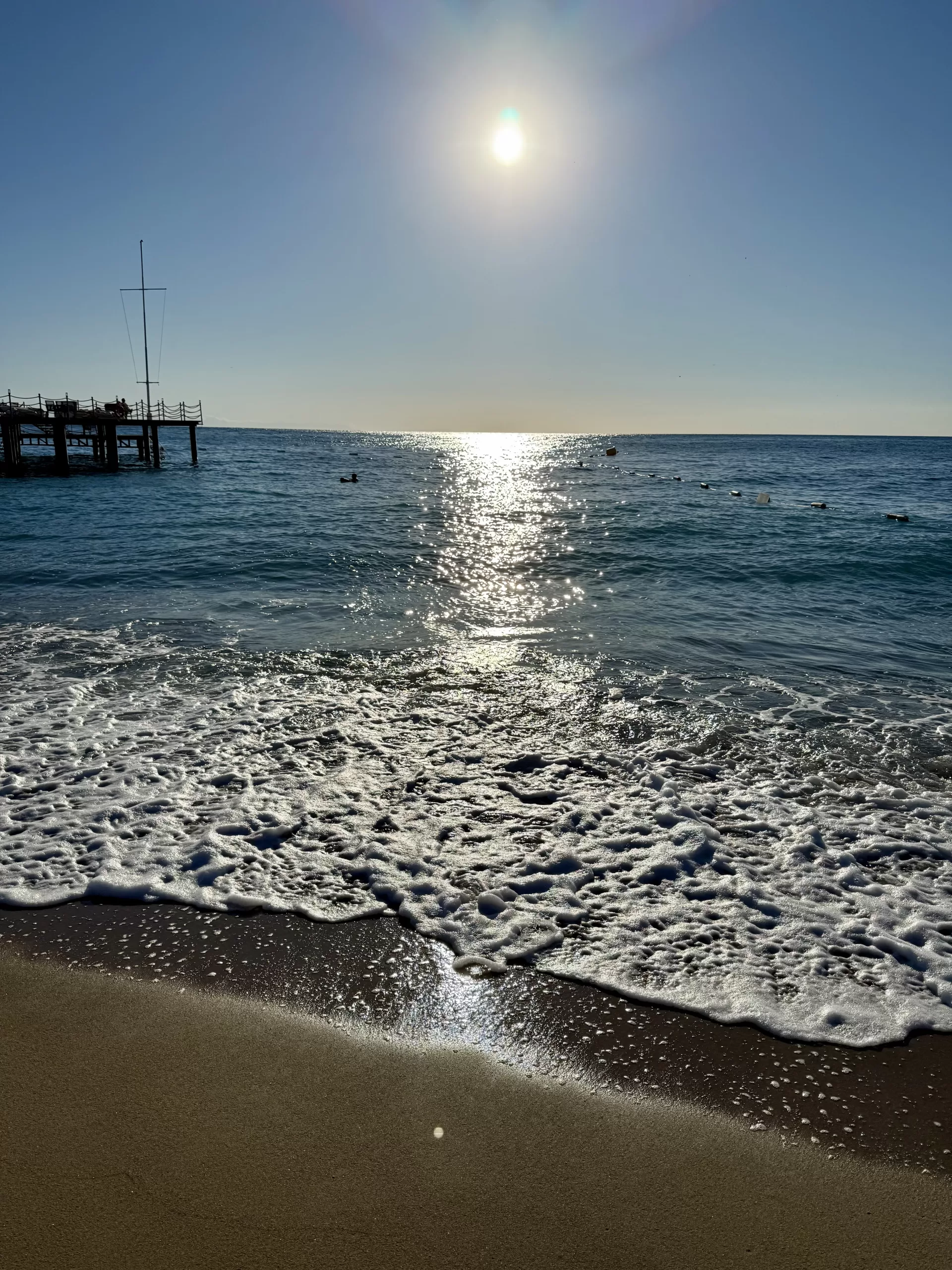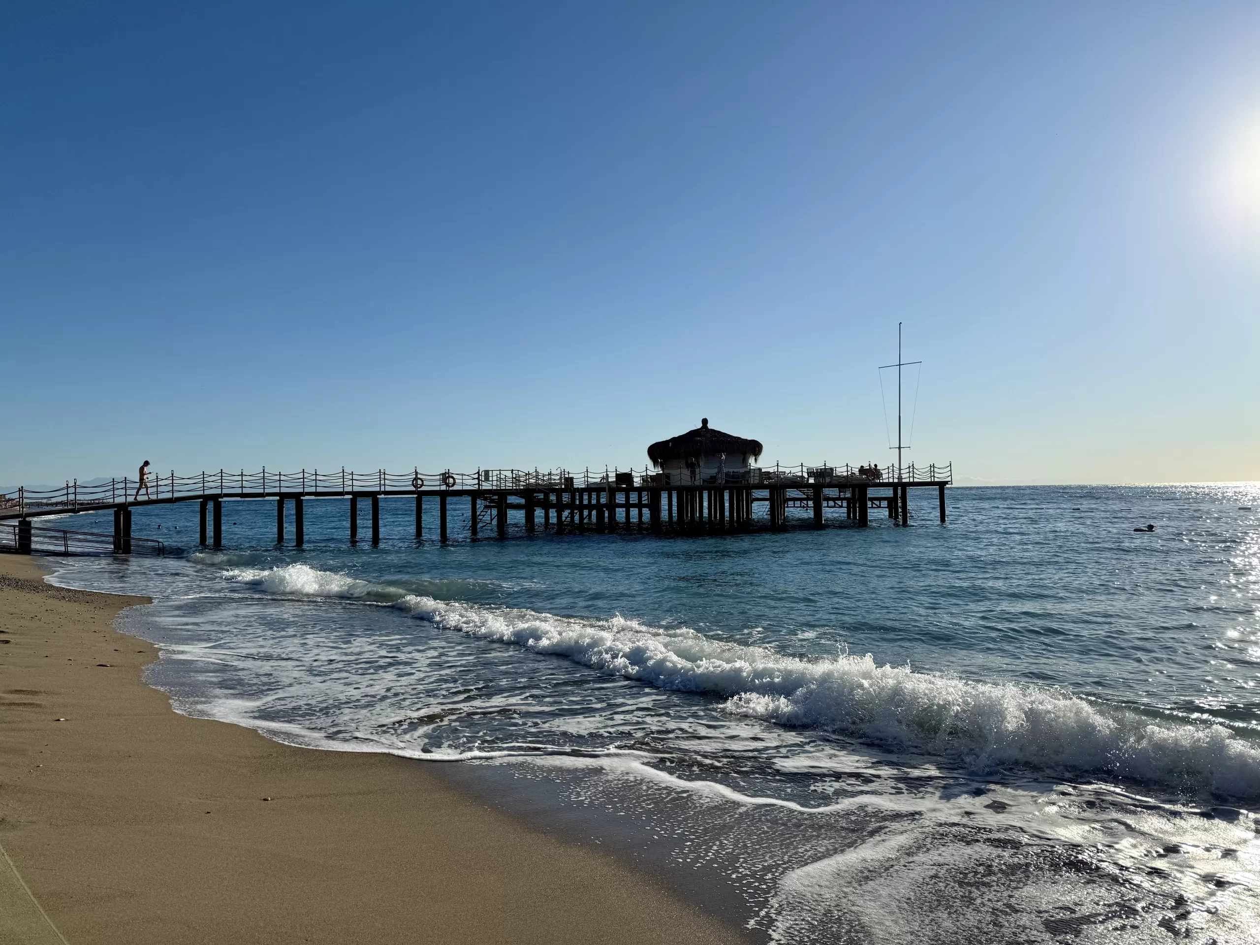 Z balkonu, z pátého patra velkého hotelu, sleduju moře, které snad nikde nekončí. A možná opravdu ne. Večery a brzká rána, kdy je klid, i moře se zklidní, jsou tady stejně nejkrásnější. Klidné, tiché. Vlny v moři se líně převalují, už zdaleka nejsou tak rozbouřené jako v odpoledním větru. V moři už se snad nikdo nekoupe – i když ano – k bójkám plavou dva podvečerní plavci.